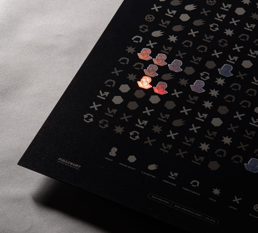 Mit der ersten MVP Edition würdigen wir eine der Ausnahmeleistung in der deutschen Sportgeschichte. Mit 24 Punkten im Halbfinale der FIBA WM 2023 führt Andi Obst das deutsche Team ins Finale. In dieser limitierten Gameprint Edition haben wir alle Punkte von Andi Obst auf ganz besondere Art verewigt – Gedruckt auf Metall und per Hand mit holografischen Elementen veredelt, ist jeder Gameprint ein Unikat und ein Tribut an ein Jahrhundert Spiel.